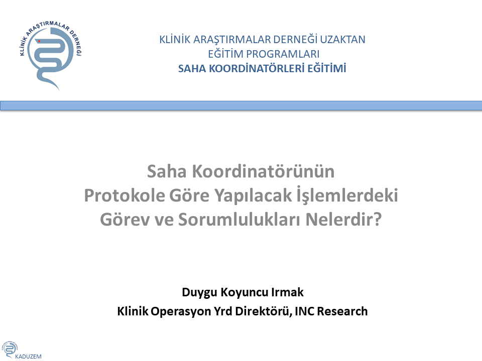Hedef; Görevli kişilerin ülkemizde klinik araştırmaları araştırma merkezlerinde ulusal ve uluslararası mevzuat ve iyi klinik uygulamalarla uyumlu, evrensel kalite standartlarında koordine edebilmesine destek olmak üzere protokol uyumu konusunu örneklerle incelemektir.